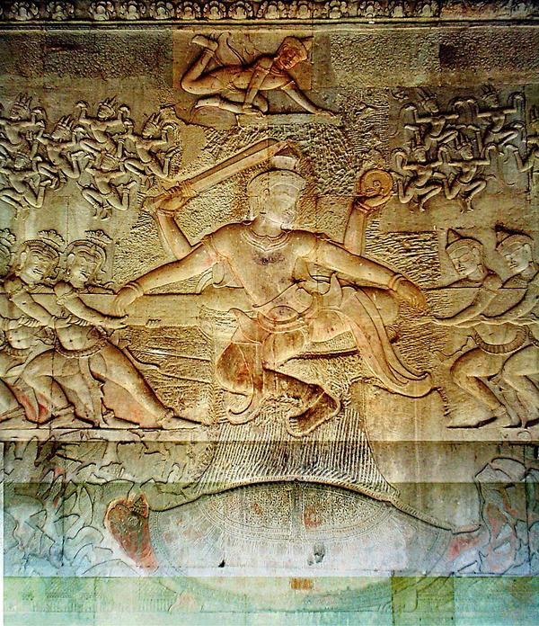 另一方面,由于印度教认为“毁灭”隐含着“再生”的含义,因此在吴哥窟中湿婆更多是以表示生殖能力男性生殖器林伽(Linga)的形象出现,象征着湿婆在毁灭中蕴藏着的创造力。关于林伽还有一段有趣的故事。毗湿奴和梵天曾经因为两者谁地位更高而争论不休。这时候一根燃烧着熊熊火焰的火柱出现,毗湿奴和梵天分别化身为野猪和天鹅,各自向下和向上寻找了一千年,都没有发现火柱的源头。实际上,这个火柱就是湿婆的林伽,两位神也因此甘拜下风。